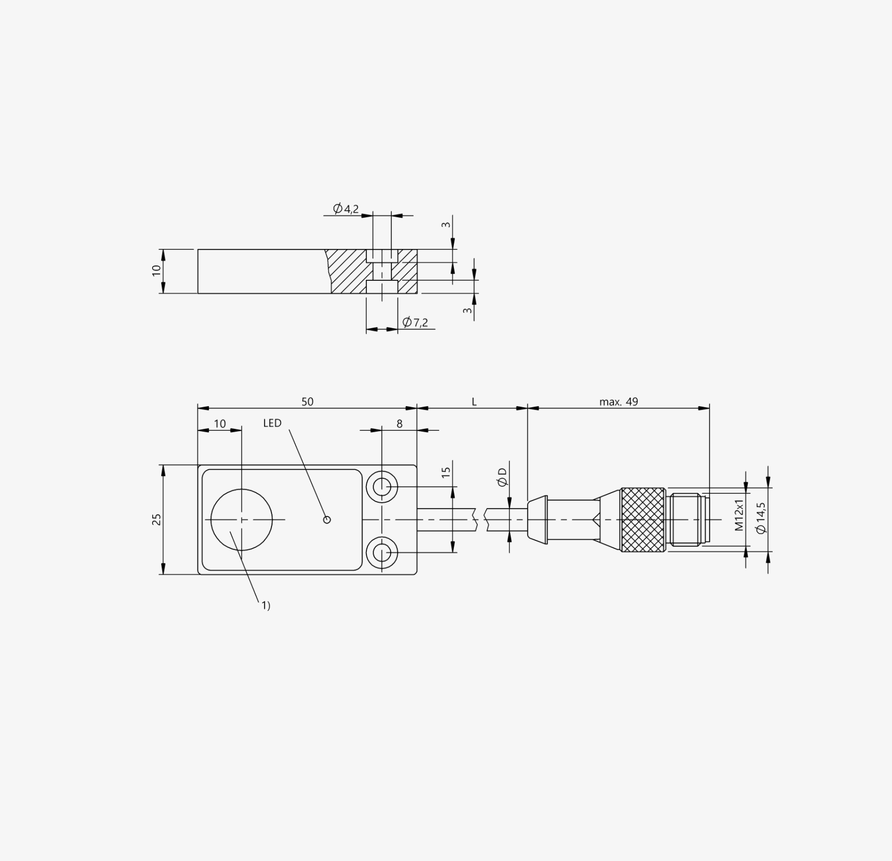 Габариты - 50 x 25 x 10 мм Стандартный корпус 50x25x10 Установка - не заподлицо Диапазон - 5 мм Выход- PNP нормально разомкнутый/нормально замкнутый (NO/NC) Частота переключения - 500 Гц Материал корпуса - Алюминий Материал рабочей поверхности - PBT Соединение Кабель с разъемом, M12x1, 4-контактный, 0,20 м, полиуретановый Рабочее напряжение U - 10...30 В постоянного тока Рабочая температура - -25...70 °C Степень защиты IP - IP67 |